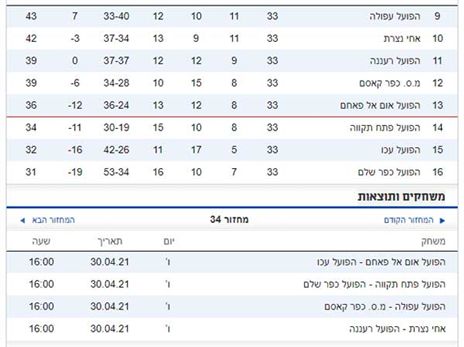 - גם בתחתית יהיה לוהט. ארבע האחרונות (הפועל אום אל פאחם, הפועל פתח תקווה, הפועל עכו והפועל כפר שלם) ישחקונה האחת נגד השנייה. אום אל פאחם תארח את הפועל עכו שבמקום ה-15, והפועל פתח תקווה שבמקום ה-14 תפגוש את כפר שלם האחרונה במושבה.