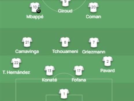צרפת בהרכב חזק לגיברלטר. אוליבייה ז'ירו, קיליאן אמבפה, אורליאן טשואמני, אדוארדו קמאבינגה ואנטואן גריזמן ב-11