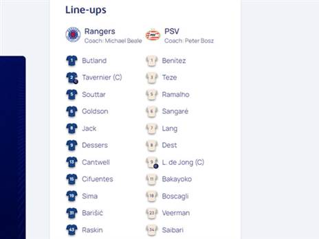 פורסמו ההרכבים למשחק בין ריינג'רס לאיינדהובן.