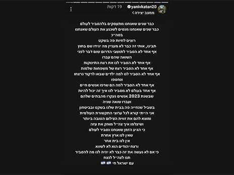 קפטן מכבי חיפה לשעבר, יניב קטן, באינסטגרם: "כבר שנים שאנחנו מתעסקים בלהסביר לעולם' כבר שנים שאנחנו מנסים לשכנע את העולם שאנחנו בסה"כ רוצים לחיות פה בשקט. תבינו, אותי זה כבר לא מעניין מה יגידו שם בחוץ".