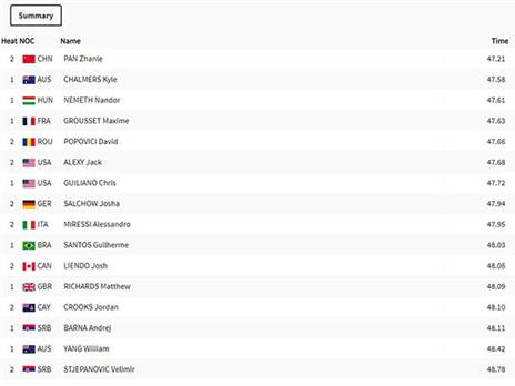 פאן ז'אנלו טס ב-50 המטרים האחרונים וניצח בחצי הגמר שלו עם זמן אדיר - 47.21 שניות. הסיני, שיאן העולם, הקדים את דויד פופוביץ', שסיים שני בזמן של 47.66. יתרון של כמעט חצי שנייה.
