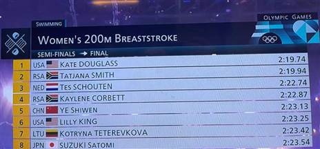 יצא לדרך חצי גמר 200 מטר חזה לנשים. טס שוטן סיימה ראשונה במקצה הראשון עם 2:22.74, קילין קורבט שנייה עם 2:22.87 ושיוון יה שלישית עם 2:23.13
