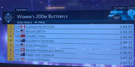 חצי הגמר הראשון ב-200 מטר פרפר נשים הסתיים. סאמר מקינטוש ראשונה עם 2:04.87, רייגן סמית' עם 2:05.39 ואליזבט דקרס עם 2:06.17