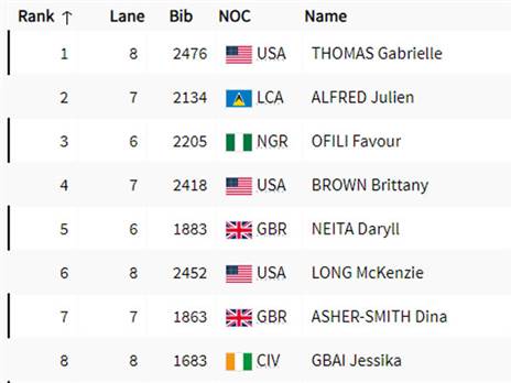 גבריאל תומאס (21.86 שניות) ודינה אשר סמית' (22.31 שניות) עלו אוטומטית לחצי הגמר גם כן