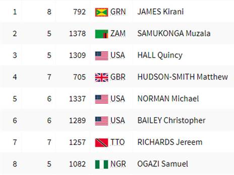 חצי הגמר השני הגיע לסיומו: קיראני ג'יימס, האלוף האולימפי ואלוף העולם מגרנאדה, סיים ראשון במקצה והעפיל לגמר יחד עם מוזאלה סאמוקונגה הזמבי. צפו>>>
