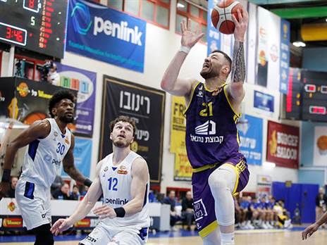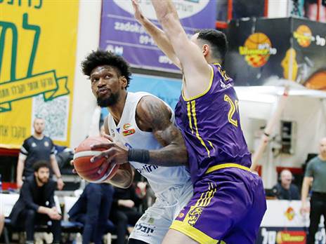 מחצית באולם היובל: הרצליה מובילה 40:42 על חולון ברבע הגמר. ג'ימי קלארק עם 14 בצד אחד, זלמנסון עם 9 מנגד (אלן שיבר)