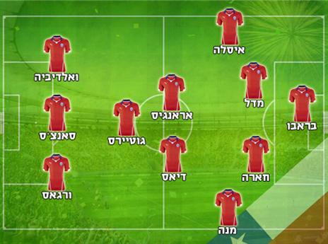 צ'ילה: קלאודיו בראבו; מאוריסיו איסלה, גארי מדל, גונסאלו חארה, אאוחניו מנה; פליפה גוטיירס, צ'ארלס אראנגיס (ארתורו וידאל), מרסלו דיאז, חורחה ואלדיביה; אלכסיס סאנצ'ס, אדוארדו וארגס.