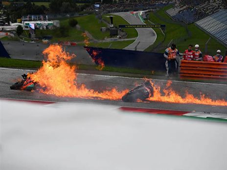 רגעים של פחד ואימה במוטו GP: לורנזו סבאדורי לא יכל להימנע מהאופנוע של דני פדרוסה בגרנד פרי שטיריה, לאחר שהספרדי החליק ונפל והאיטלקי נכנס בו בעוצמה אדירה. כתוצאה מכך, האופנועים של השניים עלו באש תוך שניות אחדות, אך למזלם של הרוכבים הם ברחו מהאזור עוד קודם לכן.